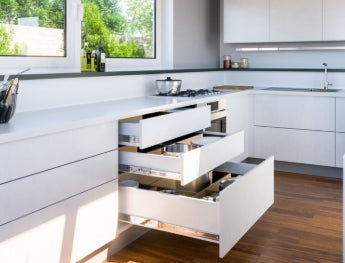 Corredera telescópica con sistema push y cierre suave, ideal para muebles sin tiradores. Proporciona apertura por presión, deslizamiento controlado y un funcionamiento silencioso y seguro.
